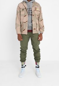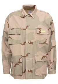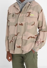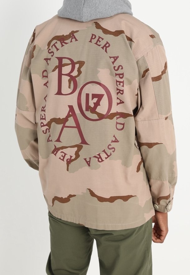 Personne portant une veste camouflage beige et marron avec l'inscription « PER ASPERA AD ASTRA » et « B A 17 » imprimée en rouge au dos.
