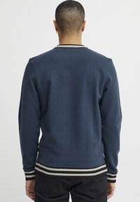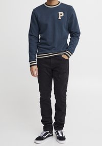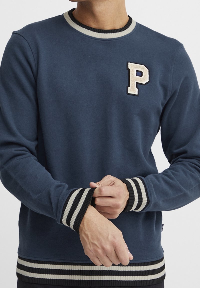 Homme ajustant la manche d'un sweat-shirt bleu marine avec col, poignets et ourlet rayés blanc et noir, et une lettre "P" blanche sur la poitrine.