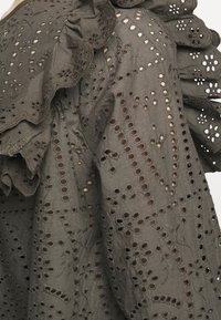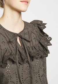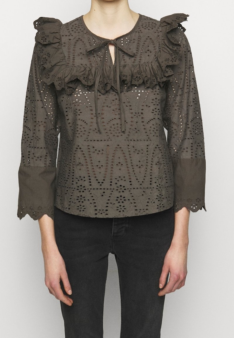 Femme portant un chemisier à œillets vert olive foncé avec col volanté et poignets festonnés, associé à un pantalon noir ajusté.