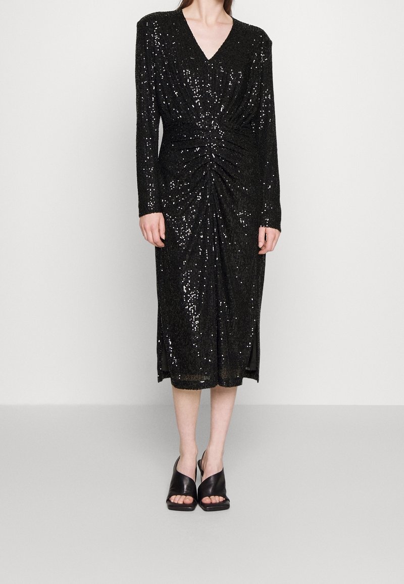 Femme portant une robe midi noire à manches longues, ornée de sequins, avec un devant froncé et des mules à talons ouvertes noires, posant devant un fond uni.