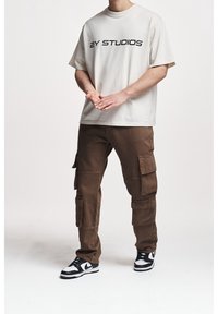 T-shirt crème à manches courtes avec le texte noir "2Y STUDIOS", associée à un pantalon cargo marron avec plusieurs poches, portée avec des baskets noires et blanches.