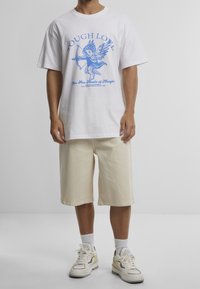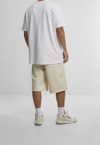 Homme portant un short en denim long blanc cassé, des chaussettes blanches montantes et des baskets crème avec des accents jaune clair et gris.