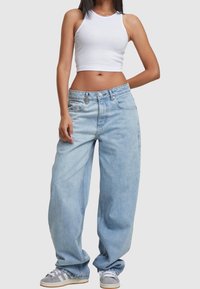 Jean en denim bleu clair à coupe ample, avec cinq poches et une texture légèrement délavée. Associé à des baskets grises et un crop top blanc.