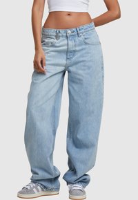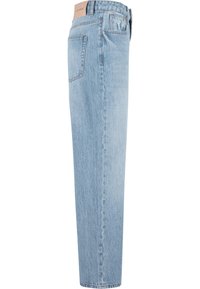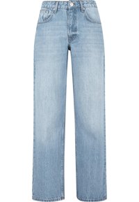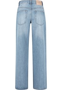 Jean large en denim bleu clair, doté de deux grandes poches arrière et de décolorations subtiles. Fini avec une fermeture à bouton et des passants de ceinture.