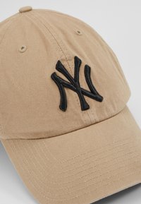 Casquette de baseball beige avec une visière incurvée et un logo "NY" brodé en noir à l'avant, présentée sur une surface blanche avec un fond gris.