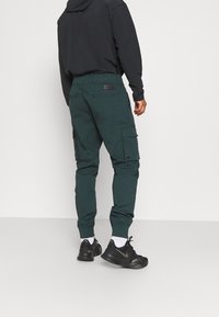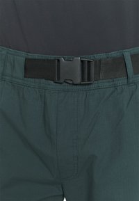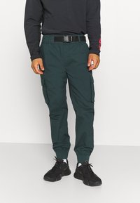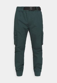 Pantalon cargo vert foncé avec poignets élastiques, poches avant et poches cargo latérales. Conçu avec une ceinture noire réglable.