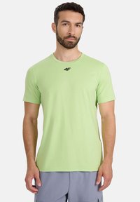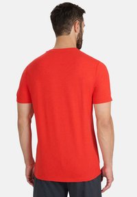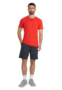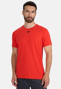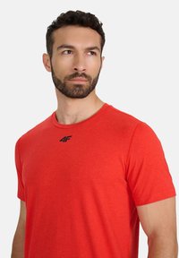 T-shirt en coton rouge à col rond et manches courtes, avec un petit logo noir sur la partie supérieure gauche de la poitrine.