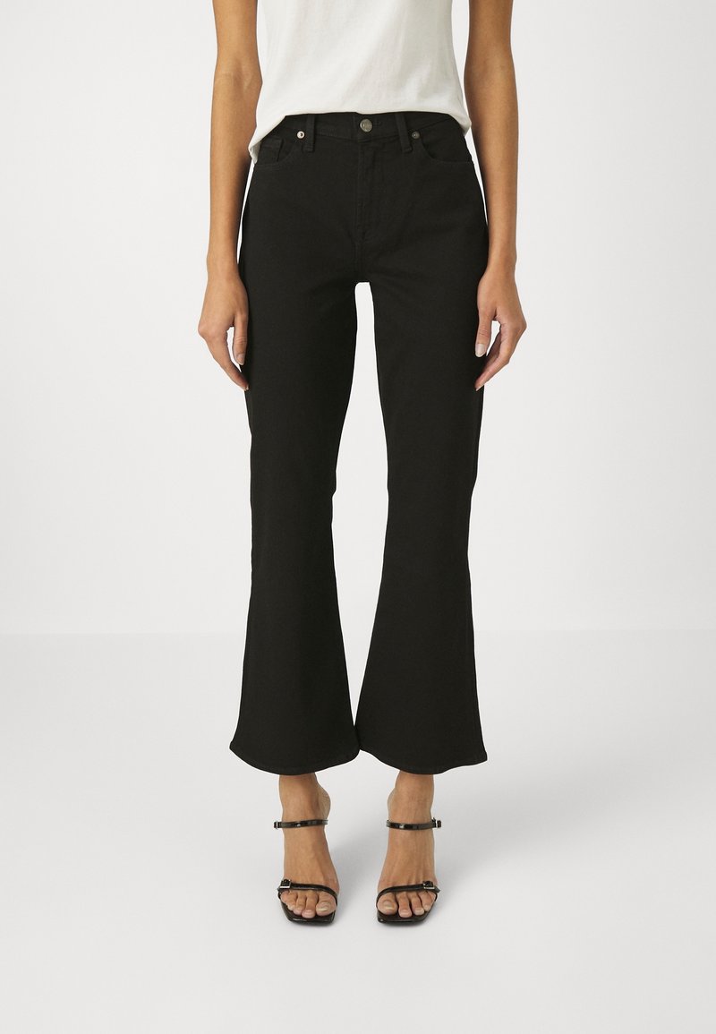 Jeans noirs évasés à taille haute, avec un design à cinq poches et une jambe légèrement raccourcie. Tissu en coton lisse avec une légère extensibilité.