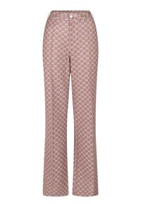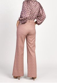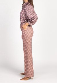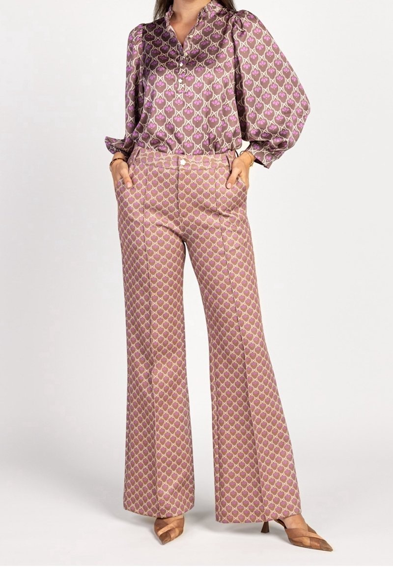 Femme portant un chemisier assorti à motifs roses et beiges avec des manches bouffantes, et un pantalon large taille haute, debout les mains dans les poches.
