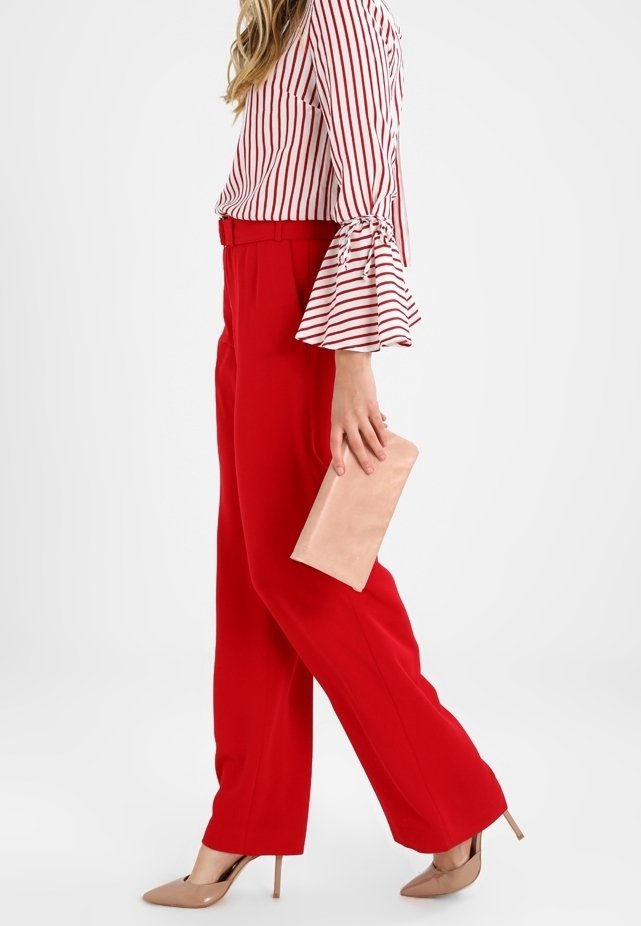 Femme portant un pantalon rouge taille haute à jambes larges, un chemisier rayé à manches longues évasées, des talons nus, tenant une pochette nude.