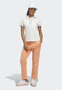 Femme aux cheveux foncés portant un polo blanc à manches courtes avec bordure noire et un pantalon à motifs orange, debout devant un fond clair uni.