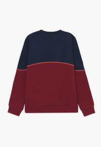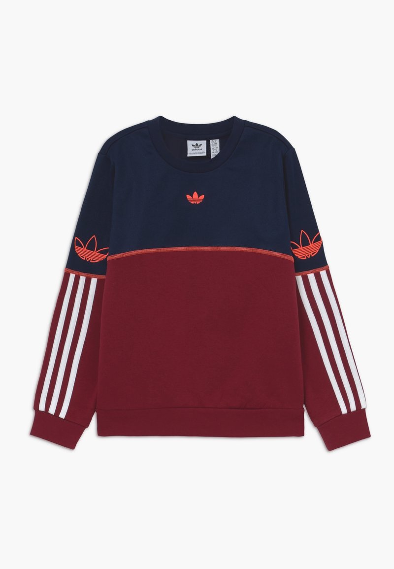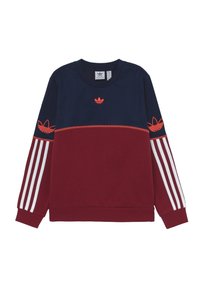 Sweatshirt Adidas à manches longues avec partie supérieure bleu marine, partie inférieure bordeaux, logos trèfle rouges sur la poitrine et les manches, et détail à trois bandes blanches sur les bras.