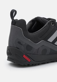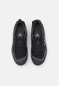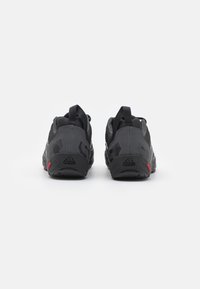 Baskets noires avec un embout renforcé, tige en textile, design à trois bandes réfléchissantes, semelle en caoutchouc et accents texturés.