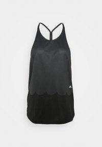 Débardeur de sport noir avec une texture lisse, un design festonné le long de l'ourlet, des bretelles nageur et un petit logo en bas à droite.