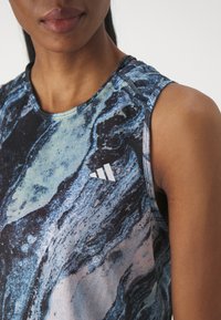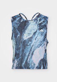 Débardeur sportif court avec un motif marbré bleu, noir et blanc ; associé à un short ajusté lavande clair avec un détail de couture.