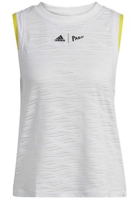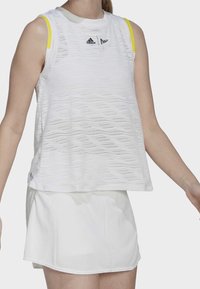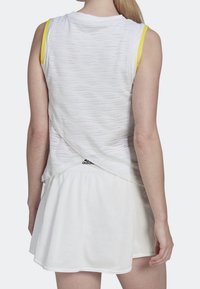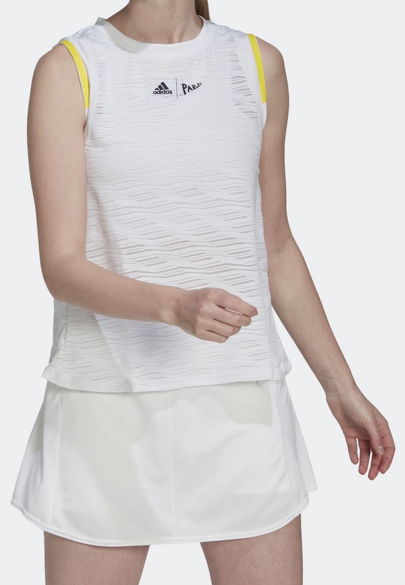 Débardeur de sport blanc avec motif texturé en forme de vagues, accents jaunes aux épaules, associé à une jupe blanche. Logo sur la poitrine. Tissu léger.