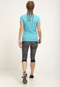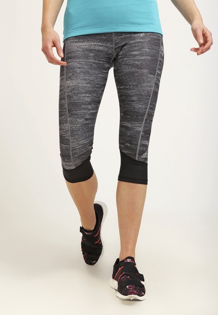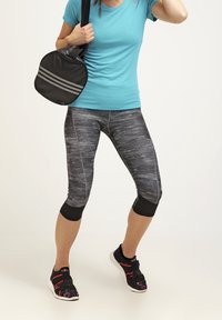 Femme marchant, portant des leggings capri gris à motif avec des poignets noirs, un haut turquoise et des chaussures de sport noires avec des accents roses.