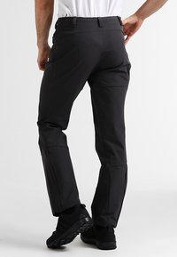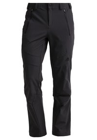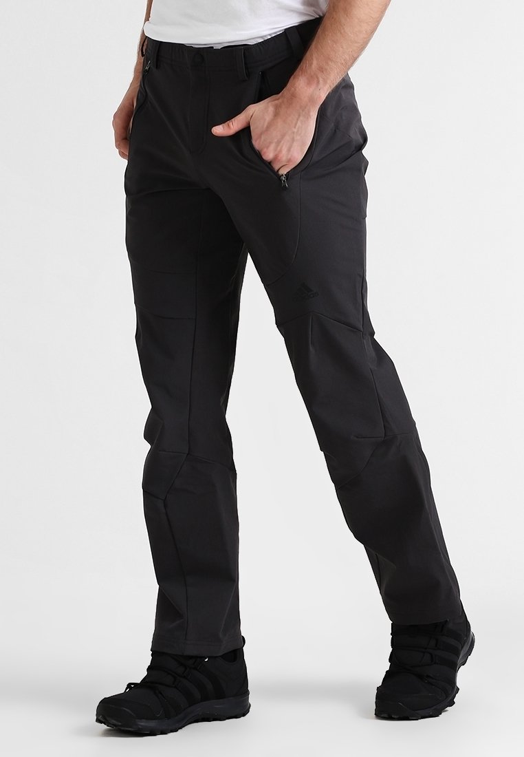 Homme portant un pantalon Adidas noir avec des poches latérales zippées et des chaussures de sport noires, debout devant un fond blanc uni.
