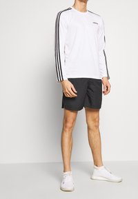 Chemise de sport à manches longues blanche avec des accents noirs, associée à un short noir avec des détails graphiques blancs et un logo, portée avec des baskets blanches.