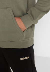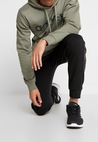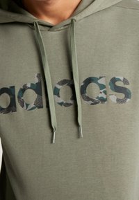 Homme portant un sweat à capuche Adidas vert clair avec un logo camouflage et un pantalon Adidas noir, les mains dans les poches du sweat.