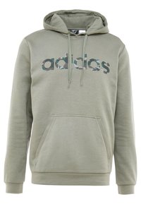 Homme portant un sweat à capuche Adidas vert olive avec un logo motif camouflage et un pantalon Adidas noir avec un logo orange, les mains dans la poche du sweat.