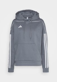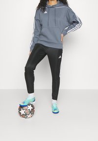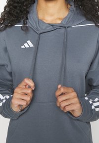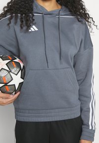 Personne portant un sweat à capuche gris Adidas avec des bandes blanches sur les manches et un pantalon Adidas noir avec des bandes blanches sur les côtés.