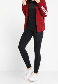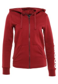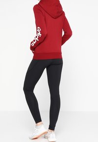Personne portant un sweat à capuche rouge à fermeture éclair avec poches avant et des leggings noirs, mains dans les poches, logo blanc visible sur la manche gauche.