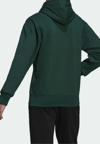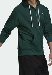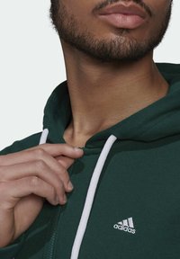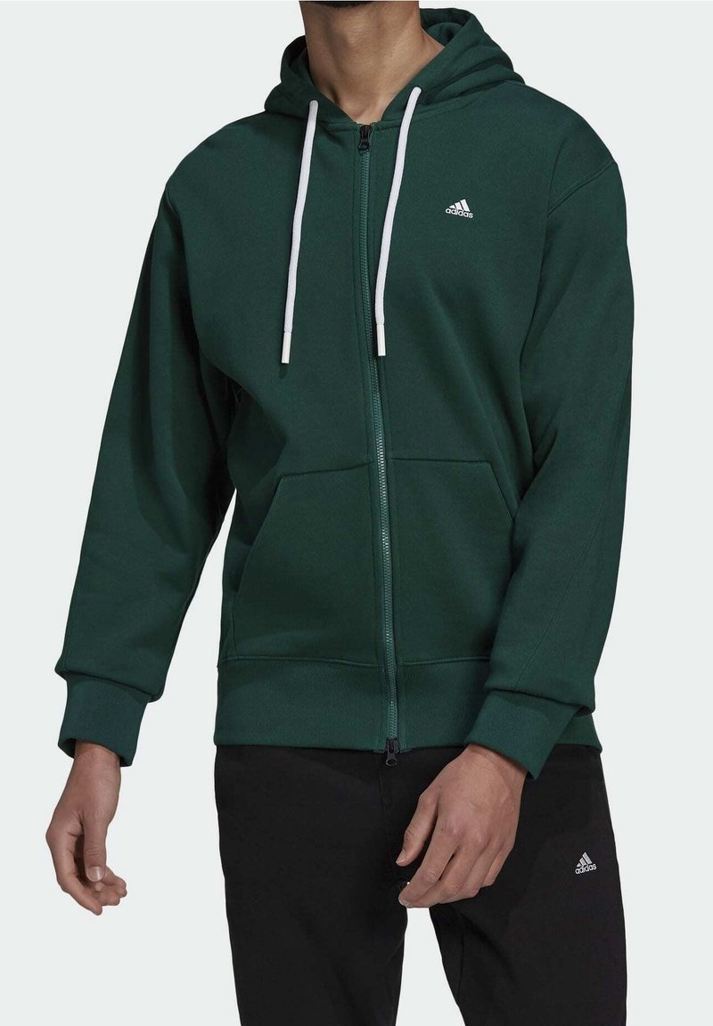 Sweat à capuche vert zippé avec poche kangourou et cordons blancs, fabriqué en tissu doux avec une coupe décontractée. Contient un petit détail de logo.