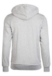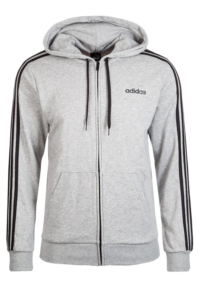 Sweat à capuche zippé Adidas gris clair avec cordons de serrage noirs, trois bandes noires le long des manches, poches kangourou, et petit logo sur la poitrine.