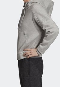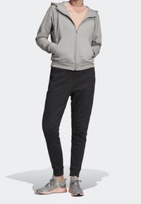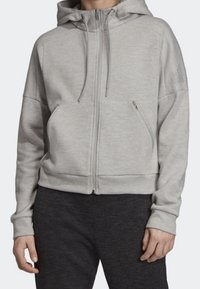 Sweat à capuche zippé gris clair avec poches avant et capuche à cordon, porté avec un pantalon foncé sur une personne debout.