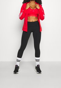 Femme portant un sweat à capuche zippé rouge Adidas avec des bandes blanches sur les manches et un legging noir, debout devant un fond uni.