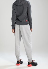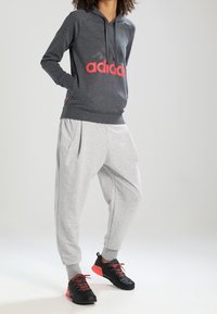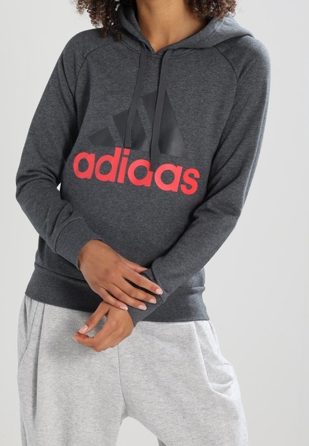 Personne portant un sweat à capuche gris foncé avec le texte rouge "adiaas" et un logo noir, associé à un pantalon gris clair texturé, les mains jointes devant.