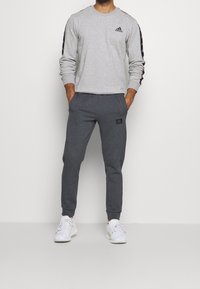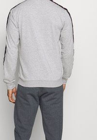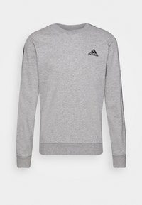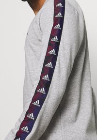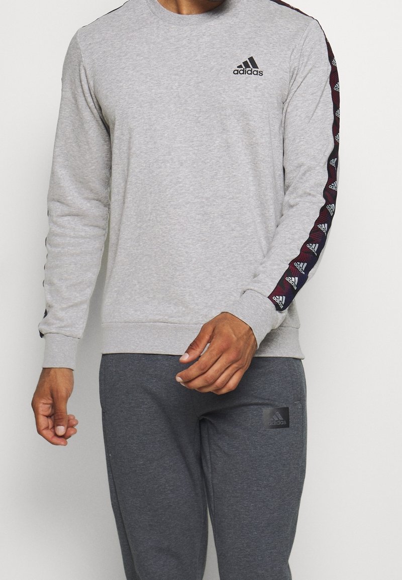 Sweat-shirt gris à manches longues, avec un logo Adidas noir sur la poitrine et une bordure marine à motifs le long des manches. Poignets côtelés et extensibles.