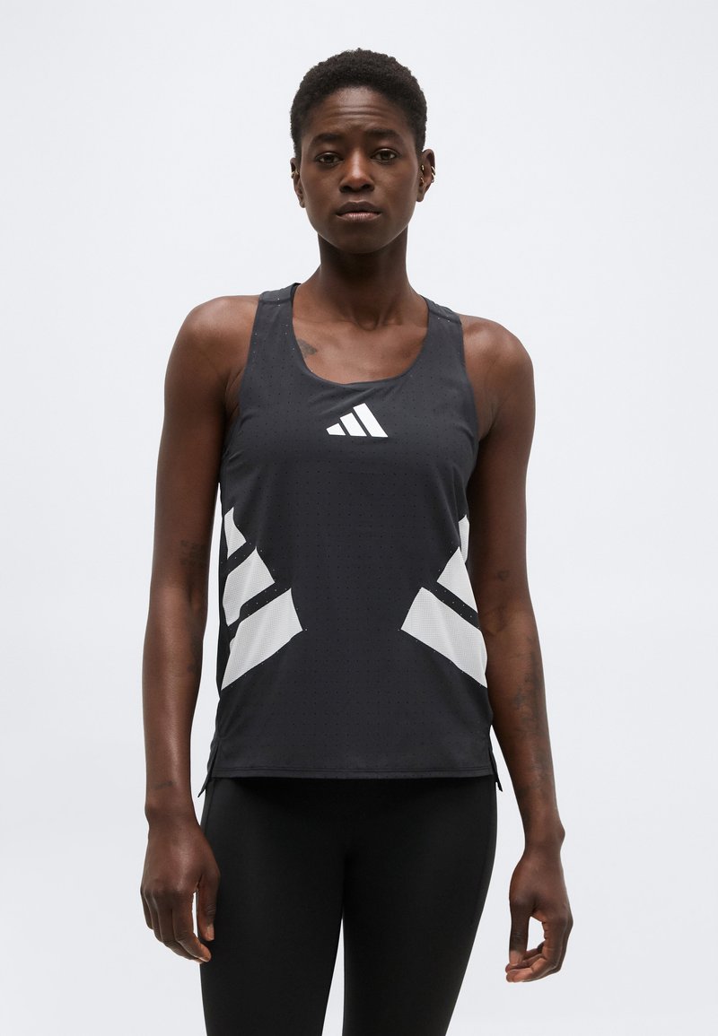 Débardeur noir de sport en tissu extensible, avec un col rond et le logo Adidas en blanc sur la poitrine.