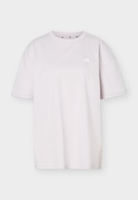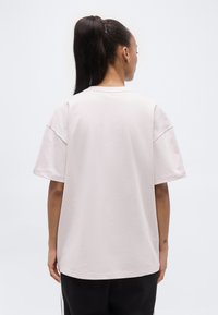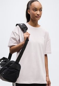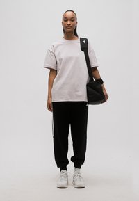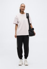 Femme aux cheveux tressés portant un T-shirt Adidas oversize beige clair et un pantalon noir, debout devant un fond blanc uni.