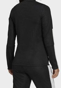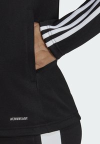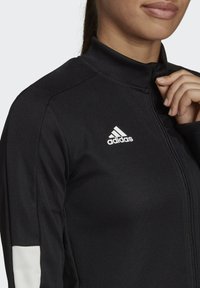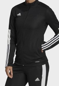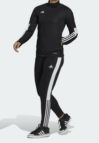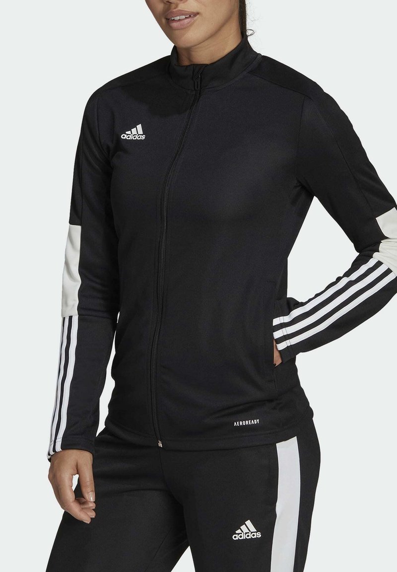 Femme portant une veste zippée noire Adidas et un pantalon assorti avec des bandes blanches et le logo, mains dans les poches, cadrée au niveau du menton.