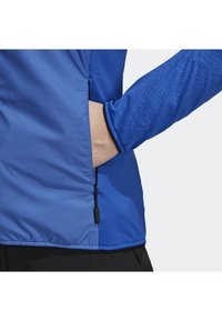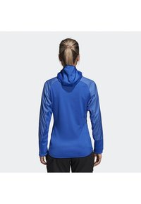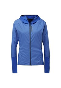 Veste de sport bleue avec capuche, fermeture éclair sur le devant et tissu texturé. Comprend des manches longues avec des trous pour les pouces, des accents contrastants et une coupe ajustée.