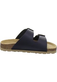 Sandale en cuir bleu marine avec deux sangles réglables à boucles argentées. Semelle intérieure en liège et semelle extérieure légère en caoutchouc avec un bord arrondi.