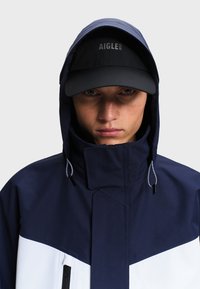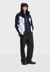 Homme portant une veste à capuche bleu marine et blanche avec fermeture éclair avant et poches, associée à un pantalon cargo noir et une casquette noire.