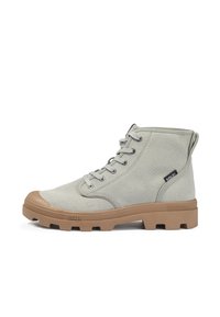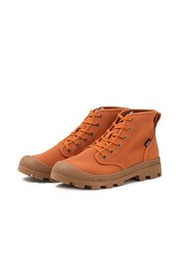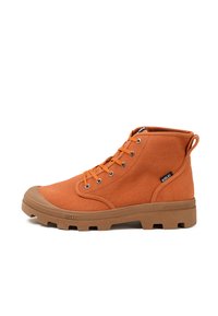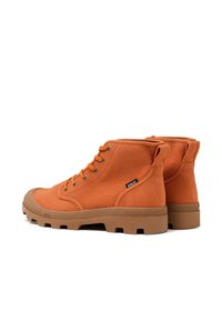 Botte montante en toile couleur rouille-orange avec semelle en caoutchouc marron, bout rond, fermeture à lacets à l'avant et languette de traction à l'arrière.
