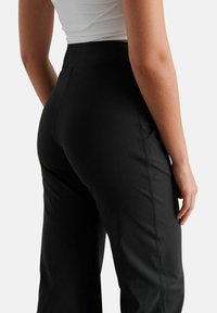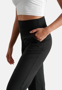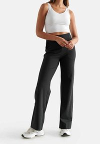 Pantalon de sport noir en tissu extensible, taille haute, jambes évasées, texture lisse, porté avec des baskets blanches.