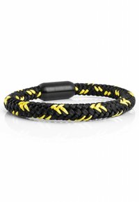 Homme adulte portant une chemise bleue et un jean bleu clair, avec un bracelet tressé noir et jaune au poignet gauche.