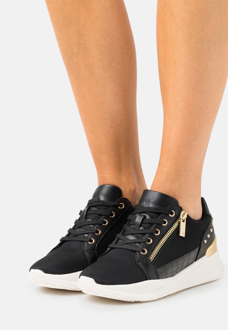 Baskets noires en tissu texturé, détail avec zip doré, et semelle blanche. Modèle à lacets avec clous décoratifs sur le talon.