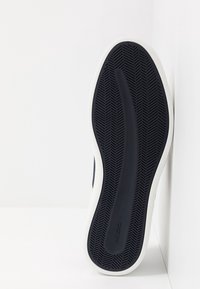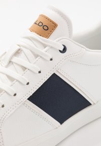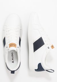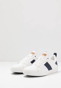 Baskets blanches avec une surface en cuir lisse, des accents en tissu bleu marine, une semelle en caoutchouc et une étiquette beige sur la languette. Présente un talon structuré.
