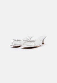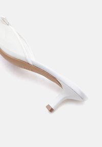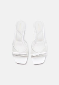 Sandale blanche à enfiler avec un petit talon kitten et une tige transparente ornée d'un petit nœud à l'avant.