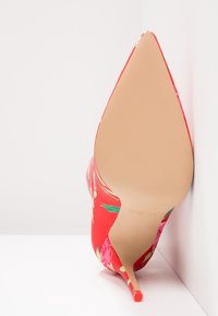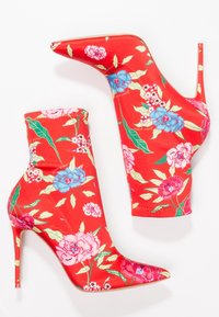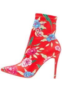 Bottines rouges à fleurs en tissu brillant, avec un bout pointu, un talon stiletto haut et un dessus froncé orné de motifs floraux colorés.