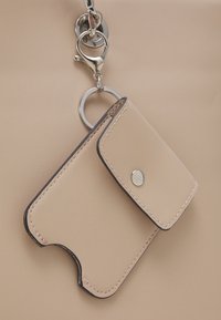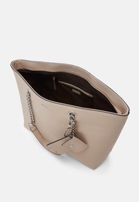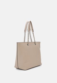 Sac fourre-tout en cuir beige avec anses en chaîne argentée et pochette assortie attachée à fermeture éclair, présenté sur fond blanc.