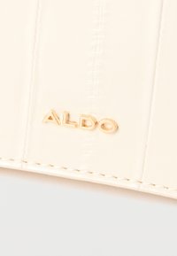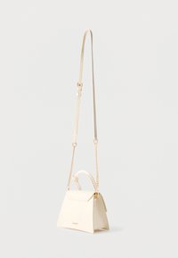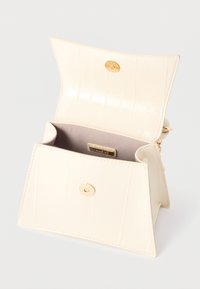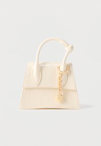 Petit sac à main couleur crème avec une poignée supérieure, un détail noué et un pendentif chaîne en or sur un fond clair uni.
