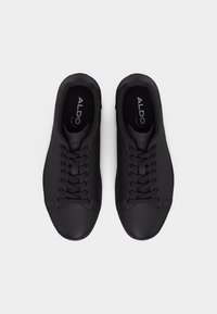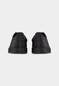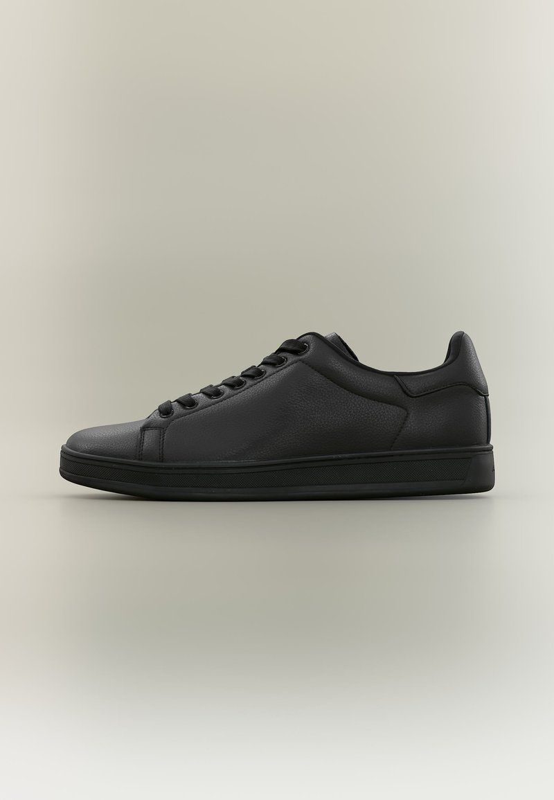 Baskets basses en cuir noir avec lacets, panneau latéral texturé et semelle en caoutchouc plate, photographiées sur un fond gris clair uni.