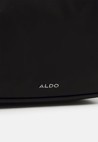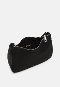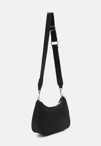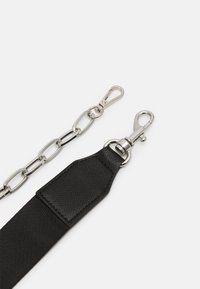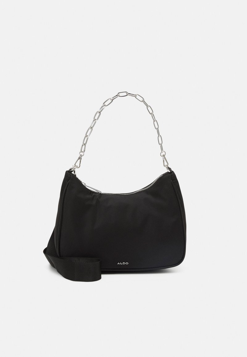 Sac bandoulière en nylon noir avec poignée en chaîne argentée, fermeture éclair et corps texturé. Comprend une bandoulière noire amovible et un détail logo.